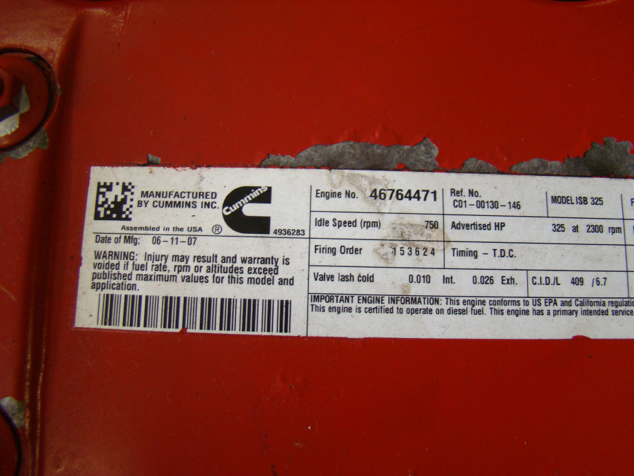 USED CUMMINS ENGINE 6.7L ISB 325 REAR DRIVE YEAR 2007. Click photo for more information